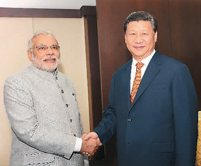 習(xí)近平強(qiáng)調(diào),中印雙方要加強(qiáng)交往,我期待著在不久的將來訪問印度,歡迎莫迪總理早日訪華。雙方要對接各自發(fā)展戰(zhàn)略,建立更加緊密的發(fā)展伙伴關(guān)系,擴(kuò)大文化、教育、宗教、青年等領(lǐng)域友好交流,在鐵路等基礎(chǔ)設(shè)施建設(shè)、產(chǎn)業(yè)投資等領(lǐng)域打造一批示范性項(xiàng)目,擴(kuò)大服務(wù)貿(mào)易、投資、旅游等領(lǐng)域合作,逐步實(shí)現(xiàn)雙邊貿(mào)易總體平衡和可持續(xù)發(fā)展,推進(jìn)孟中印緬經(jīng)濟(jì)走廊建設(shè),引領(lǐng)區(qū)域經(jīng)濟(jì)一體化進(jìn)程。中印要加強(qiáng)多邊領(lǐng)域合作,共同參與國際規(guī)則制定,增強(qiáng)發(fā)展中國家的話語權(quán)。中方歡迎印方作為創(chuàng)始成員加入亞洲基礎(chǔ)設(shè)施投資銀行。雙方要以積極和向前看的態(tài)度管控和處理分歧,通過友好協(xié)商,盡早找到公平合理、雙方都能接受的邊界問題解決辦法。在最終解決前,共同維護(hù)好邊境地區(qū)和平安寧。