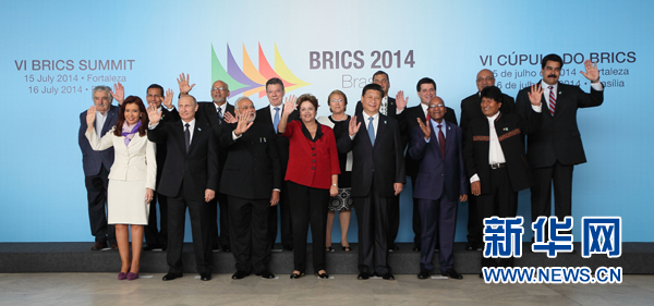????新華網(wǎng)巴西利亞7月16日電(記者陳威華、錢彤)7月16日,金磚國家同南美國家領導人對話會在巴西利亞舉行。中國國家主席習近平、巴西總統(tǒng)羅塞夫、俄羅斯總統(tǒng)普京、印度總理莫迪、南非總統(tǒng)祖馬以及蘇里南總統(tǒng)鮑特塞、阿根廷總統(tǒng)克里斯蒂娜、玻利維亞總統(tǒng)莫拉萊斯、哥倫比亞總統(tǒng)桑托斯、智利總統(tǒng)巴切萊特、厄瓜多爾總統(tǒng)科雷亞、圭亞那總統(tǒng)拉莫塔爾、巴拉圭總統(tǒng)卡特斯、秘魯總統(tǒng)烏馬拉、烏拉圭總統(tǒng)穆???、委內(nèi)瑞拉總統(tǒng)馬杜羅等南美國家領導人共同出席。