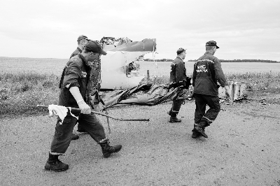 19日,在烏克蘭頓涅茨克州的MH17航班墜機(jī)現(xiàn)場,救援人員搬運(yùn)遇難者遺體圖/新華社