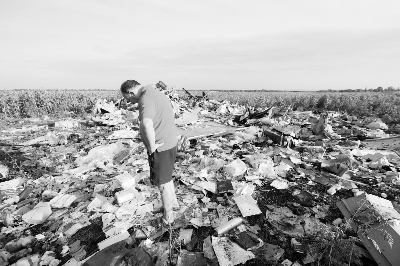 19日,在烏克蘭頓涅茨克州,一名當(dāng)?shù)孛癖娬驹隈R航MH17航班墜機(jī)現(xiàn)場 圖/新華社