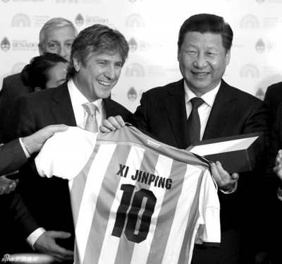 ????在和阿根廷副總統(tǒng)兼參議長布杜及眾議長多明格斯舉行會談時(shí),習(xí)近平特別提到阿根廷足球隊(duì)在世界杯奪得亞軍,他說:“剛才眾議長先生問我是否喜歡足球,我說我非常喜歡足球。他也祝愿中國能夠早日舉辦一屆世界杯,這正是我的愿望。但是我們足球的發(fā)展,還希望同阿根廷加強(qiáng)交流合作,靠你們的幫助,提高我們的水平?!?/p>
