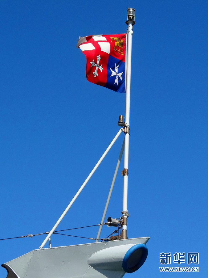 ????意大利海軍軍旗。帶領(lǐng)記者參觀的工作人員說(shuō),軍旗上的四塊標(biāo)志代表了意大利的四個(gè)不同城市。新華網(wǎng)記者 周喆 攝