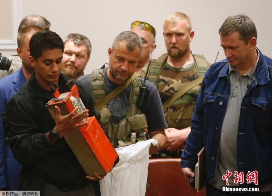 當(dāng)?shù)貢r間2014年7月22日,頓涅茨克,“頓涅茨克人民共和國”官員向馬來西亞調(diào)查人員移交馬航MH17航班客機(jī)黑匣子。