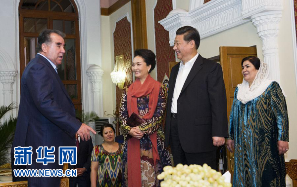 ????9月12日,國(guó)家主席習(xí)近平在杜尚別出席塔吉克斯坦總統(tǒng)拉赫蒙舉行的家宴。這是習(xí)近平和夫人彭麗媛在拉赫蒙夫婦陪同下參觀總統(tǒng)官邸。新華社記者黃敬文攝