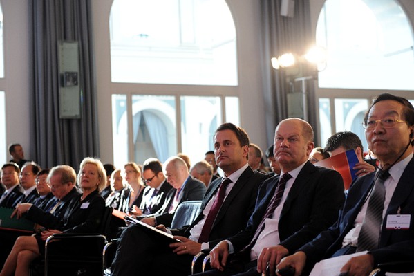 ????盧森堡首相貝特爾(右三)、漢堡市市長(zhǎng)舍爾茨(右二)、中國(guó)工業(yè)經(jīng)濟(jì)聯(lián)合會(huì)會(huì)長(zhǎng)李毅中(右一)出席第六屆漢堡峰會(huì)開幕式。新華社記者商婧攝