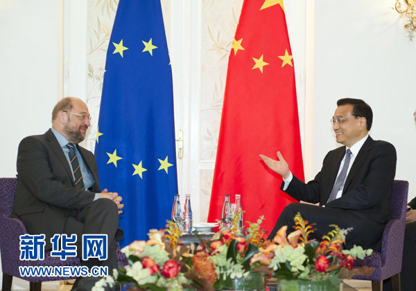李克強(qiáng)指出,中國高度重視發(fā)展同包括歐洲議會(huì)在內(nèi)的歐盟機(jī)構(gòu)的關(guān)系,愿與歐方加強(qiáng)互信,深化合作,擴(kuò)大共同利益,通過對(duì)話與協(xié)商解決分歧。我期待不久后在米蘭出席第十屆亞歐首腦會(huì)議期間,同歐洲理事會(huì)主席范龍佩、歐盟委員會(huì)主席巴羅佐舉行會(huì)晤,回顧過去,展望未來,推動(dòng)中歐全面戰(zhàn)略伙伴關(guān)系取得新發(fā)展。期待歐洲議會(huì)繼續(xù)為此發(fā)揮積極作用。