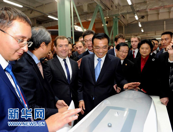 ????中國科技與創(chuàng)新展區(qū)集中展示了中國高速鐵路機車、核電、航天、高端制造和通信等領(lǐng)域的科研成果。在高速動車展臺前,李克強和梅德韋杰夫聽取項目負責人介紹中國自主研發(fā)的新一代高速動車組。梅德韋杰夫詢問,這種高鐵是否能在高寒地區(qū)運行。李克強說,中國高鐵擁有在高寒地區(qū)運行的豐富經(jīng)驗,技術(shù)有保障。