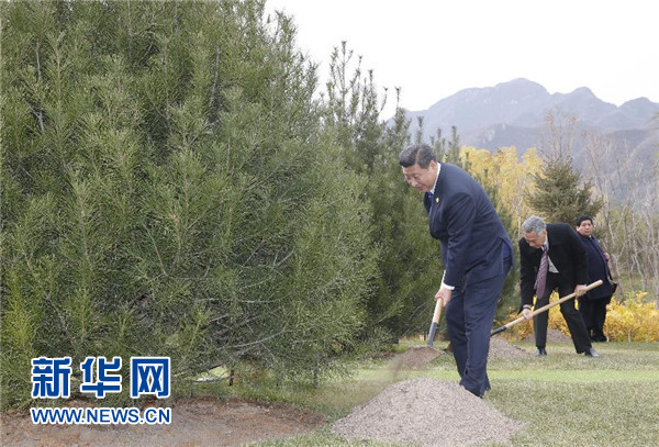 11月11日,國(guó)家主席習(xí)近平同亞太經(jīng)合組織經(jīng)濟(jì)體領(lǐng)導(dǎo)人或代表一道,在雁棲島上的夏園共同種下21棵白皮松,紀(jì)念亞太經(jīng)合組織成立25周年,表達(dá)對(duì)亞太互信、包容、合作、共贏的良好祝愿。