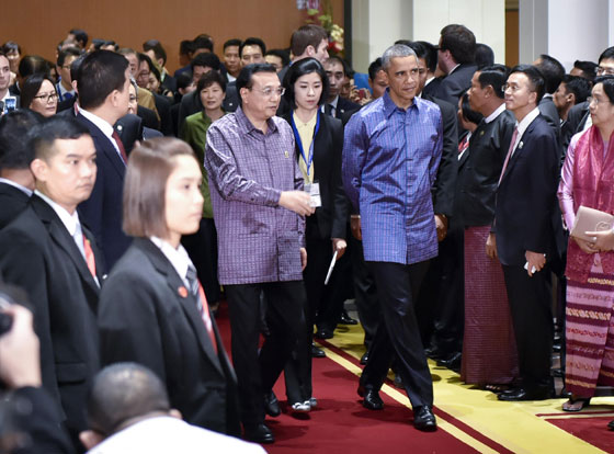 晚宴前,18位與會(huì)國領(lǐng)導(dǎo)人和潘基文身著緬甸特色服飾,站在印有緬甸名勝大金寺、大金石圖案的背景板前合影,克強(qiáng)總理站在正中間,“東道主”吳登盛一邊是奧巴馬,一邊是克強(qiáng)總理,足見主辦方對(duì)中國的重視。
