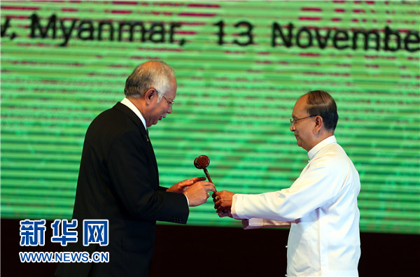 ????閉幕式上,馬來西亞總理納吉布從吳登盛手中接過象征東盟輪值主席國(guó)職權(quán)的金色木槌。馬來西亞將成為2015年東盟輪值主席國(guó)。