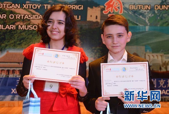 并列獲得烏茲別克斯坦第一屆“漢語橋”中學(xué)生中文比賽第二名的塔什干59中學(xué)的濟(jì)耶杜拉耶夫和東方學(xué)院尤努薩巴特區(qū)附中的希托拉波魯(女)。