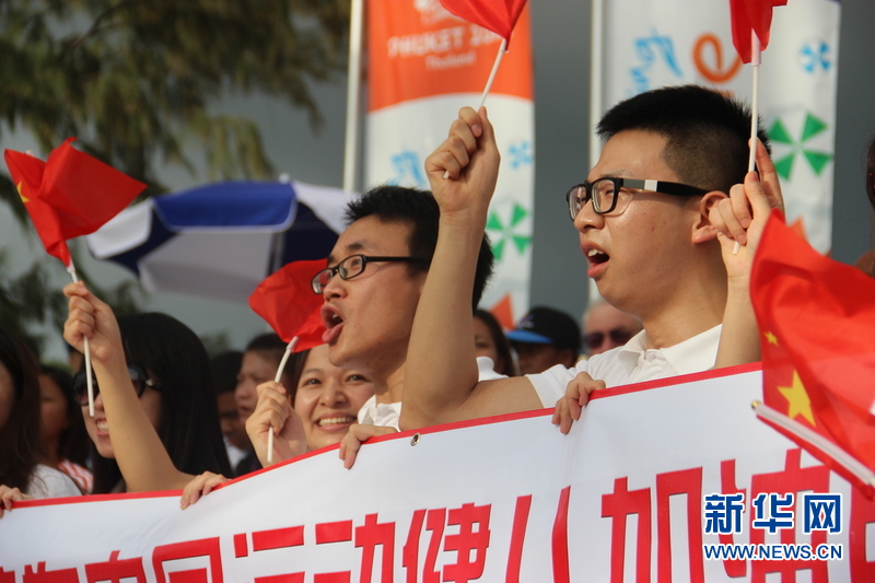 ??? 11月16日,普吉孔子學院的中國志愿者老師們?yōu)橹袊\動健兒加油。中國體育代表團16日在泰國普吉舉行的第四屆亞洲沙灘運動會上勇奪2枚金牌和2枚銅牌。當天比賽全部結束時,中國隊以3金2銀5銅的成績暫列獎牌榜第五,東道主泰國隊以9金11銀12銅的成績暫列金牌榜和獎牌榜第一。新華社記者楊云燕攝