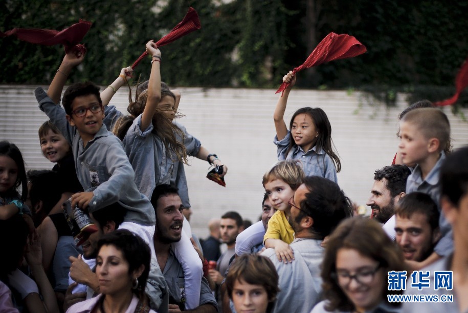 表演結(jié)束后,Jana和同伴們一起慶?!隘B人塔”成功。新華社巴塞羅那分社攝影師Pau Barrena 攝