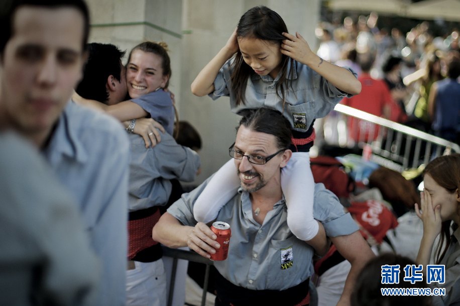 ????Jana騎在養(yǎng)父的肩膀上來到表演現(xiàn)場,兩人一起準備參加一場在巴塞羅那進行的表演。新華社巴塞羅那分社攝影師Pau Barrena 攝