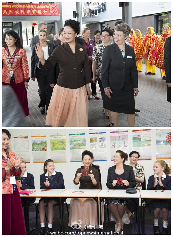??? 新華網(wǎng)北京11月19日電 據(jù)新華社“新國際”微博報道,習(xí)近平主席夫人彭麗媛19日在悉尼參觀育文武女子學(xué)校,在舞龍隊引導(dǎo)下來到孔子課堂?!鞍兹找郎奖M……”16名女孩朗誦《登鸛雀樓》,還學(xué)打中國結(jié)、制作剪紙、繡織漢字“中澳友誼長存”。彭麗媛拿起剪刀,剪出一個“福”字。?