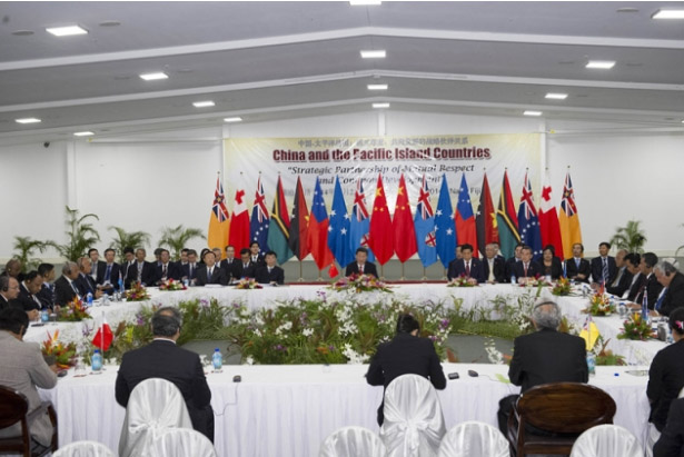 ????會議廳寬敞明亮,背景布上醒目地用中英文寫著“中國—太平洋島國:相互尊重、共同發(fā)展的戰(zhàn)略伙伴關(guān)系”。這一伙伴關(guān)系的確立,是習(xí)主席和8位島國領(lǐng)導(dǎo)人一致同意的重要成果。背景布前面擺著中國和8個(gè)太平洋島國的國旗,很是好看。整個(gè)會議廳,被布置得喜氣洋洋。