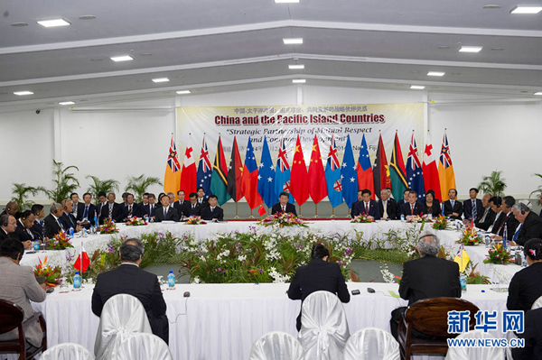 ???? 11月22日,國家主席習(xí)近平在楠迪同斐濟總理姆拜尼馬拉馬、密克羅尼西亞聯(lián)邦總統(tǒng)莫里、薩摩亞總理圖伊拉埃帕、巴布亞新幾內(nèi)亞總理奧尼爾、瓦努阿圖總理納圖曼、庫克群島總理普納、湯加首相圖伊瓦卡諾、紐??偫硭忍窖髰u國領(lǐng)導(dǎo)人舉行集體會晤。習(xí)近平主持會議并發(fā)表主旨講話。新華社記者 饒愛民攝