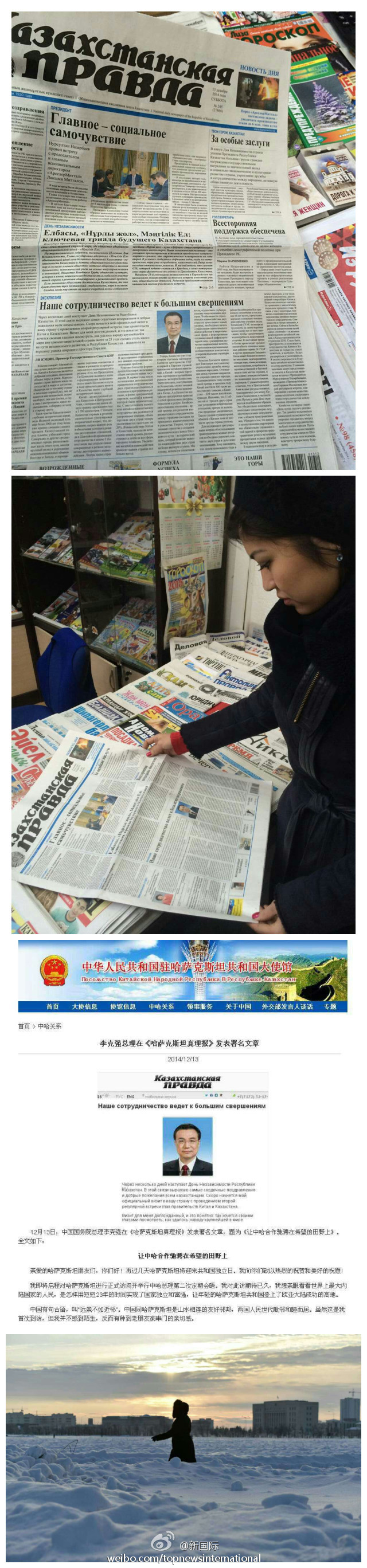 ????新華網(wǎng)北京12月13日電? 據(jù)新華社“新國際”微博報(bào)道,哈薩克斯坦真理報(bào)13日頭版刊登李克強(qiáng)總理訪前發(fā)表的署名文章《讓中哈合作馳騁在希望的田野上》??偫肀硎?,中哈是友好鄰邦,歷史淵源深厚,戰(zhàn)略互信不斷加深,利益融合愈加緊密,他對(duì)中哈合作未來充滿信心。李克強(qiáng)還就即將到來的哈薩克斯坦獨(dú)立日向當(dāng)?shù)孛癖娭乱宰YR和祝愿。