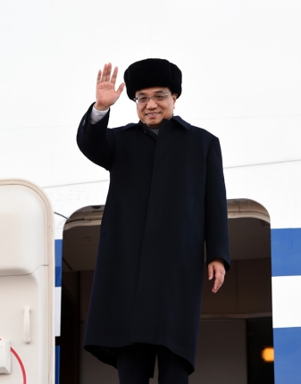 專機艙門打開,克強總理身著大衣,頭戴皮帽,一邊走下舷梯一邊向大家揮手致意。