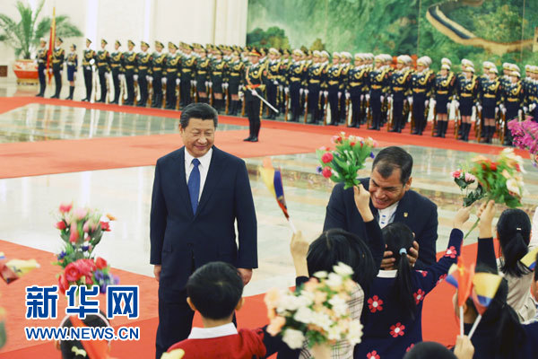 ??? 1月7日,國(guó)家主席習(xí)近平在北京人民大會(huì)堂同厄瓜多爾總統(tǒng)科雷亞舉行會(huì)談。這是會(huì)談前,習(xí)近平在人民大會(huì)堂北大廳為科雷亞舉行歡迎儀式。新華社記者姚大偉攝