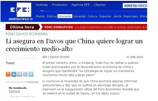 22日,西班牙埃菲社報(bào)道了李克強(qiáng)總理在達(dá)沃斯世界經(jīng)濟(jì)論壇上的致辭,特別提到他就中國經(jīng)濟(jì)增速放緩的回應(yīng)。報(bào)道中引用李克強(qiáng)總理的話:“中國經(jīng)濟(jì)進(jìn)入新常態(tài),經(jīng)濟(jì)由高速增長轉(zhuǎn)為中高速增長。發(fā)展則必須由中低端水平邁向中高端水平,為此要堅(jiān)定不移地推動結(jié)構(gòu)性改革?!?/p>