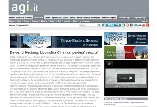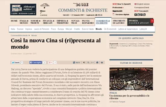 意大利24小時太陽報(bào)1月22日發(fā)表題為《中國重新向世界自我介紹》的評論性文章,介紹了李克強(qiáng)在世界經(jīng)濟(jì)論壇上的講話。文章稱,雖然國際社會一直在用西方國家的種族主義中心心態(tài)以及舊的眼光看待中國,中國國務(wù)院總理李克強(qiáng)的長期戰(zhàn)略眼光和他的新政策還是給達(dá)沃斯的聽眾們留下深刻印象。