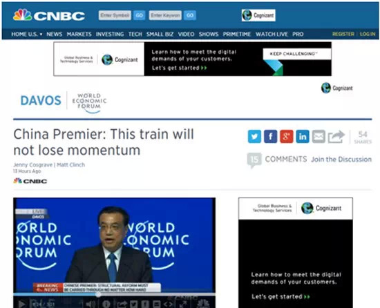 華爾街日報(bào)、彭博新聞社、金融時報(bào)、CNBC和美聯(lián)通訊社等美國主流媒體,都報(bào)道了李克強(qiáng)總理在達(dá)沃斯論壇上有關(guān)中國將避免經(jīng)濟(jì)硬著陸,以及確保在中長期經(jīng)濟(jì)有所增長的講話。