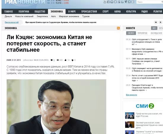 俄新社以一篇題為《中國經(jīng)濟(jì)不會失速,而會更加穩(wěn)定》的文章,報(bào)道了中國經(jīng)濟(jì)的發(fā)展前景。文中稱,2014年中國經(jīng)濟(jì)發(fā)展速度是7.4%,這是1990年以來的一個低點(diǎn),但中國經(jīng)濟(jì)的發(fā)展正在體現(xiàn)“新常態(tài)”,即體現(xiàn)在質(zhì)的提升。