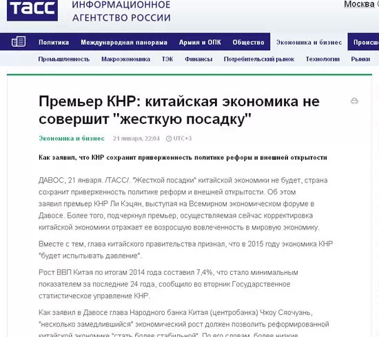 塔斯社發(fā)表了一篇名為《中國總理:中國經(jīng)濟(jì)不會硬著陸》的文章。文中指出,李克強(qiáng)和中國央行行長周小川在達(dá)沃斯論壇期間均表示,中國將深化改革開放,漸緩的增長速度有利于中國經(jīng)濟(jì)的轉(zhuǎn)型。在3月份舉行的中國兩會上,中國政府將提出新的經(jīng)濟(jì)發(fā)展規(guī)劃,速度肯定不會是北京追求的首要目標(biāo)。