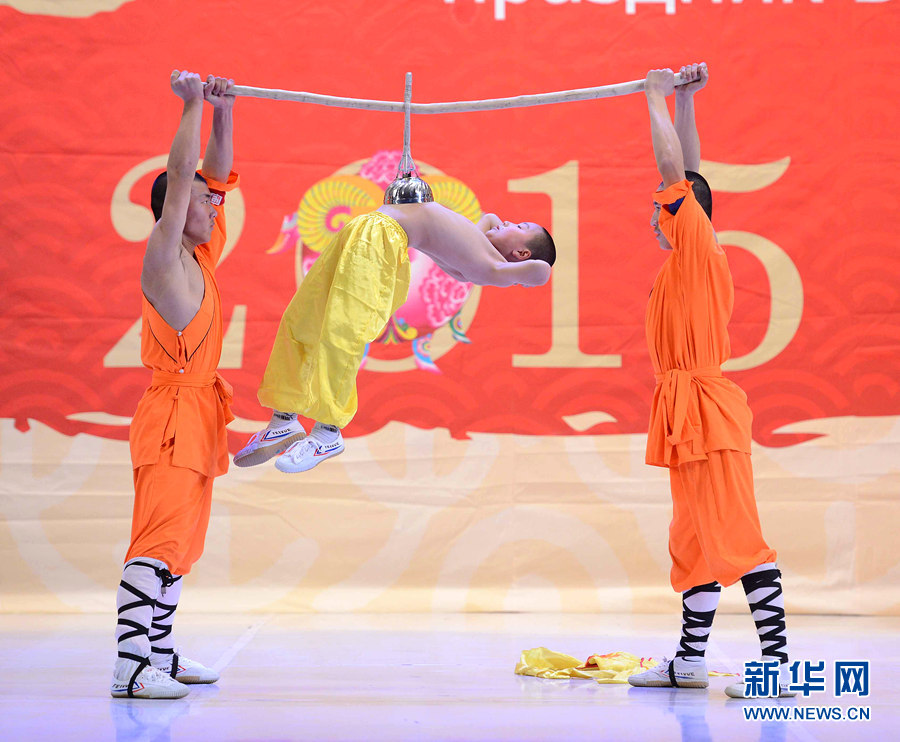 2月4日晚,在烏茲別克斯坦首都塔什干突厥宮,藝術(shù)家在表演中國武術(shù)和舞蹈。新華網(wǎng)記者 沙達(dá)提 攝