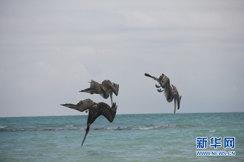 數只鵜鶘在加拉帕戈斯群島中部的圣克魯斯(Santa Cruz)島捕食。