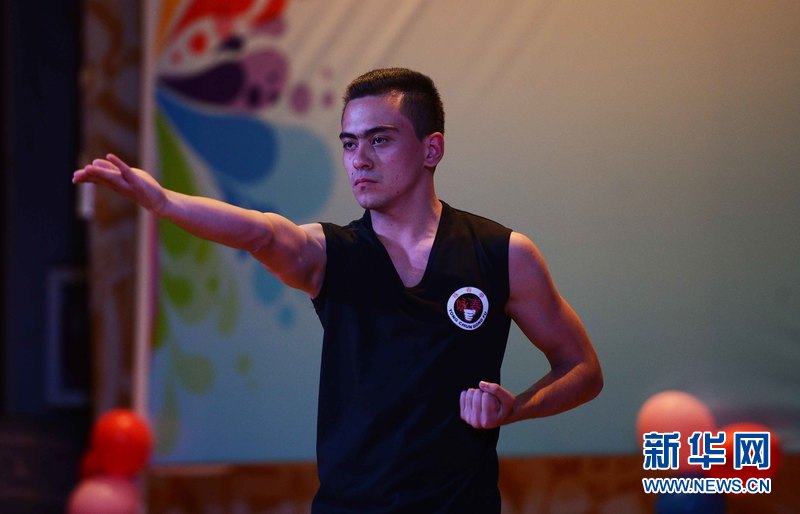 4月28日,在烏內(nèi)務(wù)部文化宮禮堂,來自烏茲別克斯坦世界語言大學(xué)的DJAVDAT(中文名:張睿)在參加比賽。新華網(wǎng)記者 沙達提攝