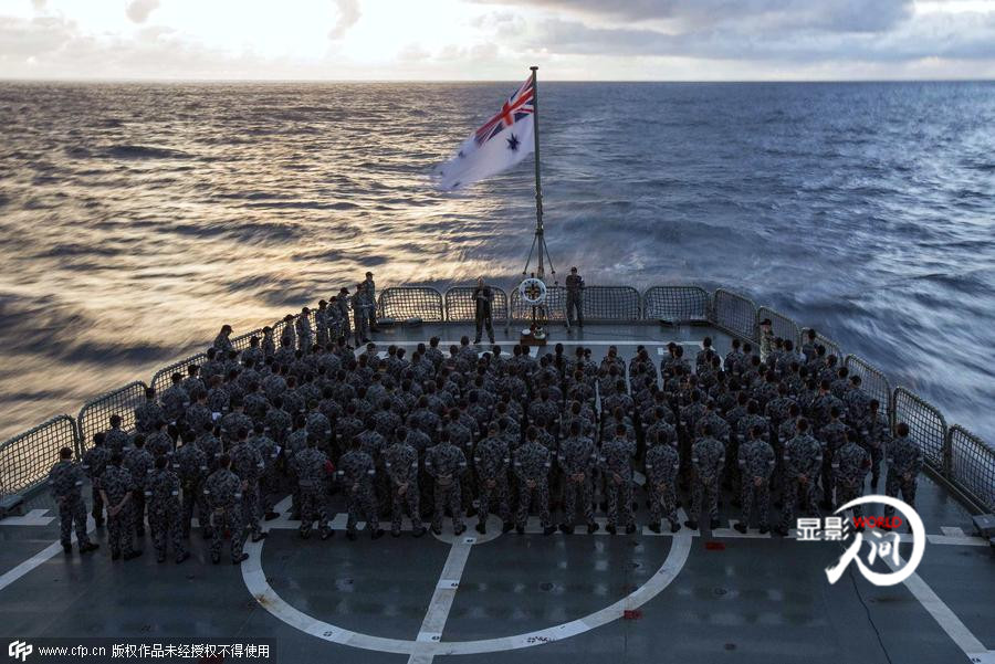 從南中國海、馬六甲海峽,再到南印度洋。馬航MH370的搜救工作可謂是一波三折。2014年4月26日,參加馬航失聯(lián)航班搜尋的澳大利亞海軍士兵參加澳紐軍團(tuán)日黎明升旗儀式。