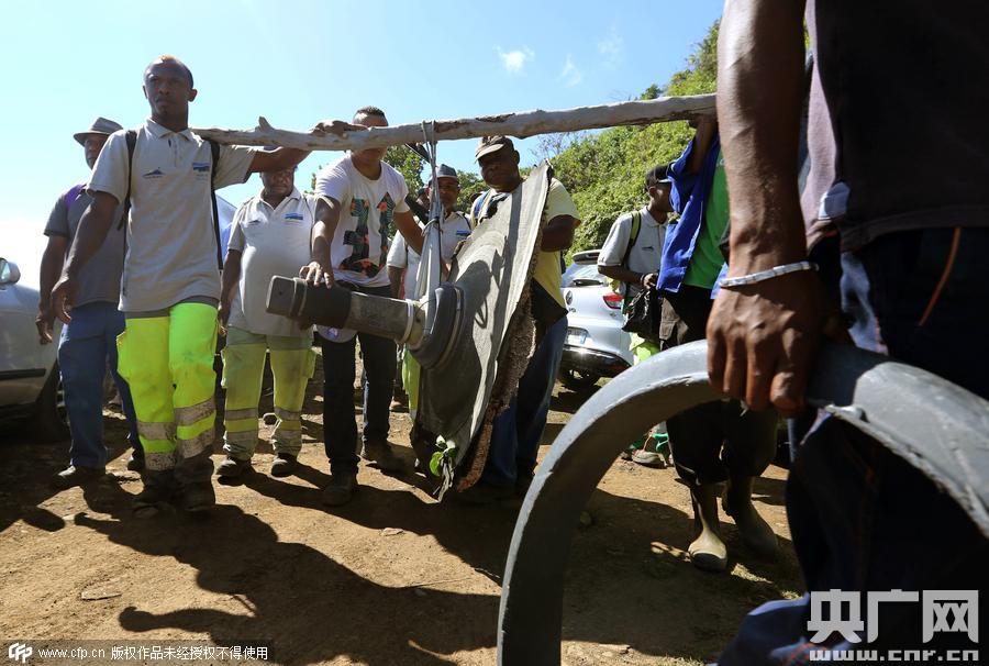 當(dāng)?shù)貢r(shí)間2015年8月11日,法屬留尼汪島,當(dāng)?shù)厮丫汝?duì)獲得的馬航MH370殘骸。