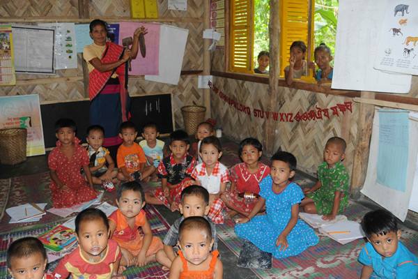 ↑2009年7月17日,孟加拉國東南部科格拉焦里縣,孩子們在聯(lián)合國兒童基金會支持的社區(qū)發(fā)展計劃下接受學(xué)前教育。(新華社記者黃亞男攝)