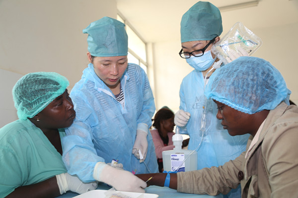2014年12月10日,解放軍援塞醫(yī)療隊為中塞友好醫(yī)院由留觀中心轉(zhuǎn)型為留觀診療中心開展輸液培訓活動。這是中方隊員在教授塞方護理人員留置針的穿刺方法。 新華社發(fā)(戴欣 攝)