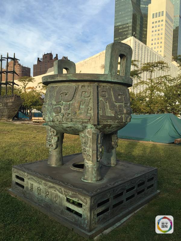 1995年10月,為紀(jì)念聯(lián)合國成立50周年,中國向聯(lián)合國紐約總部贈送了一座重約1.5噸的“世紀(jì)寶鼎”。這座鼎目前安放在聯(lián)合國大樓北花園的草坪上,鼎座高0.5米,象征聯(lián)合國成立50周年;鼎身高2.1米,象征21世紀(jì);底座上飾56條夔龍,象征56個民族都是龍的傳人。