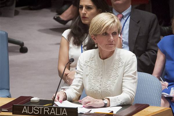↑2015年7月29日,在位于美國紐約的聯(lián)合國總部,澳大利亞外交部長畢曉普(前)在安理會上發(fā)言。