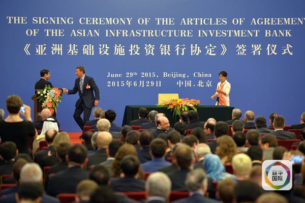 ????2015年6月29日,《亞洲基礎(chǔ)設(shè)施投資銀行協(xié)定》簽署儀式在北京舉行。當(dāng)日,英國(guó)授權(quán)代表(臺(tái)上中)在簽署《協(xié)定》后與儀式主持、財(cái)政部副部長(zhǎng)史耀斌握手。