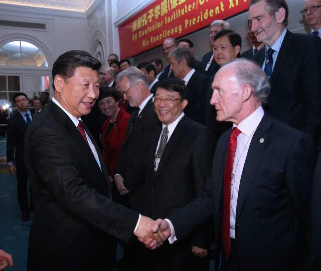 習(xí)近平指出,近年來,孔子學(xué)院在英國快速發(fā)展。目前,英國已經(jīng)建立起29所孔子學(xué)院和126個孔子課堂,數(shù)量居歐洲之首。全英孔子學(xué)院取得的碩果也是中英人文交流蓬勃發(fā)展的縮影。通過人文交流,中英兩國文化中的精華正在對兩國人民的思維方式和生活方式產(chǎn)生著奇妙的“化學(xué)反應(yīng)”。“為之不厭,誨人不倦?!毕M谧魑唤處熢俳釉賲枺瑸橹杏⒂押檬聵I(yè)添磚加瓦。希望孔子學(xué)院繼續(xù)秉承“相互尊重、友好協(xié)商、平等互利”的校訓(xùn),為傳播文化、溝通心靈、促進世界文明多樣性作出新的更大貢獻。