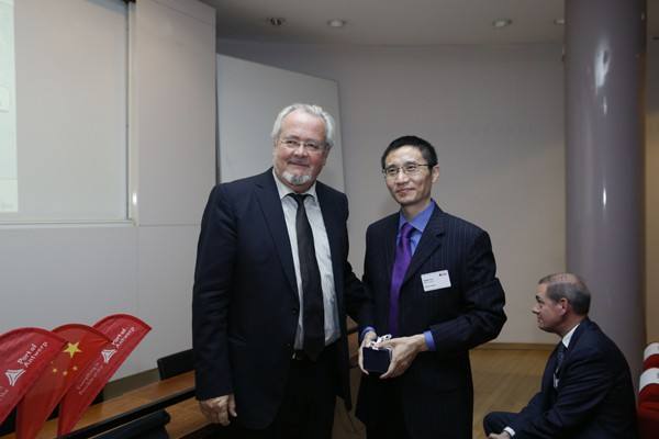 ↑安特衛(wèi)普港務(wù)局主席Marc van Peel向出席活動的中國駐比利時大使館商務(wù)參贊郭建軍合影。
