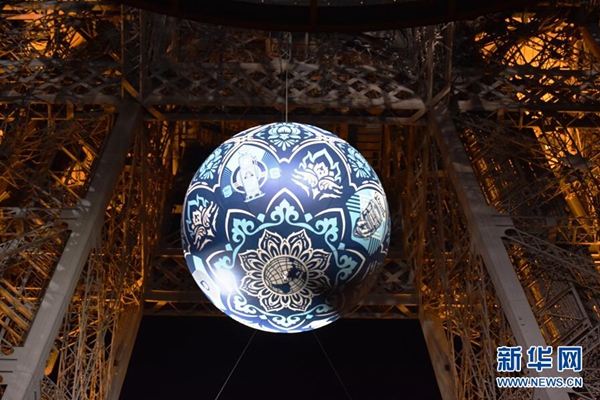 11月23日,在法國巴黎,一個名為“地球危機”的大圓球懸掛在埃菲爾鐵塔上。