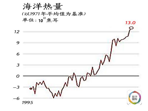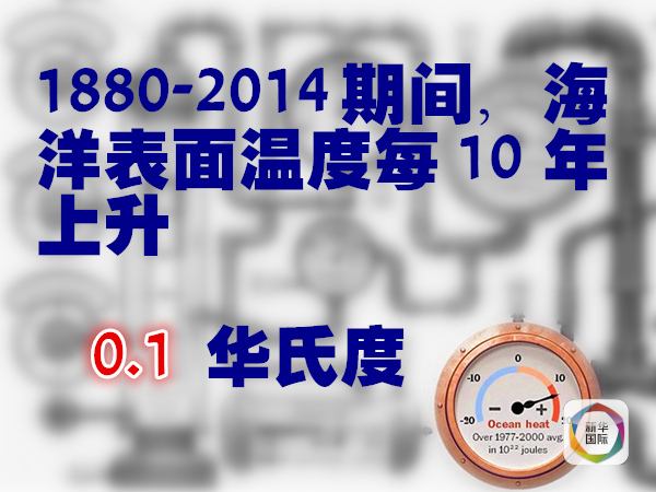 據(jù)美國獨(dú)立機(jī)構(gòu)氣候總站統(tǒng)計(jì),從1880年到2014年,海洋表面溫度每10年平均升高0.1華氏度。如果按照海洋儲存熱量的變化來看,以10的22次方焦耳為單位、1971年為基準(zhǔn),1955年海洋儲存熱量在負(fù)3個(gè)單位以下,2014年則超過13個(gè)單位。