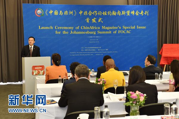 12月3日在南非約翰內(nèi)斯堡拍攝的《中國(guó)與非洲》雜志約翰內(nèi)斯堡峰會(huì)??装l(fā)式現(xiàn)場(chǎng)。新華社記者 孫瑞博攝