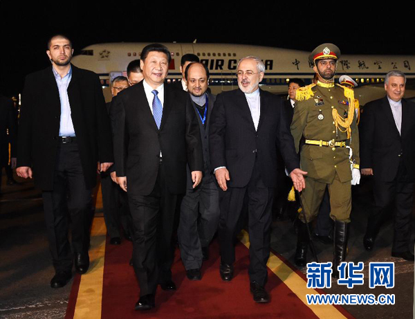 圖為1月22日,國(guó)家主席習(xí)近平乘專(zhuān)機(jī)抵達(dá)伊朗首都德黑蘭,開(kāi)始對(duì)伊朗進(jìn)行國(guó)事訪(fǎng)問(wèn)。這是在梅赫拉巴德機(jī)場(chǎng),習(xí)近平受到伊朗外交部長(zhǎng)扎里夫等熱情迎接。(新華社記者饒愛(ài)民攝)