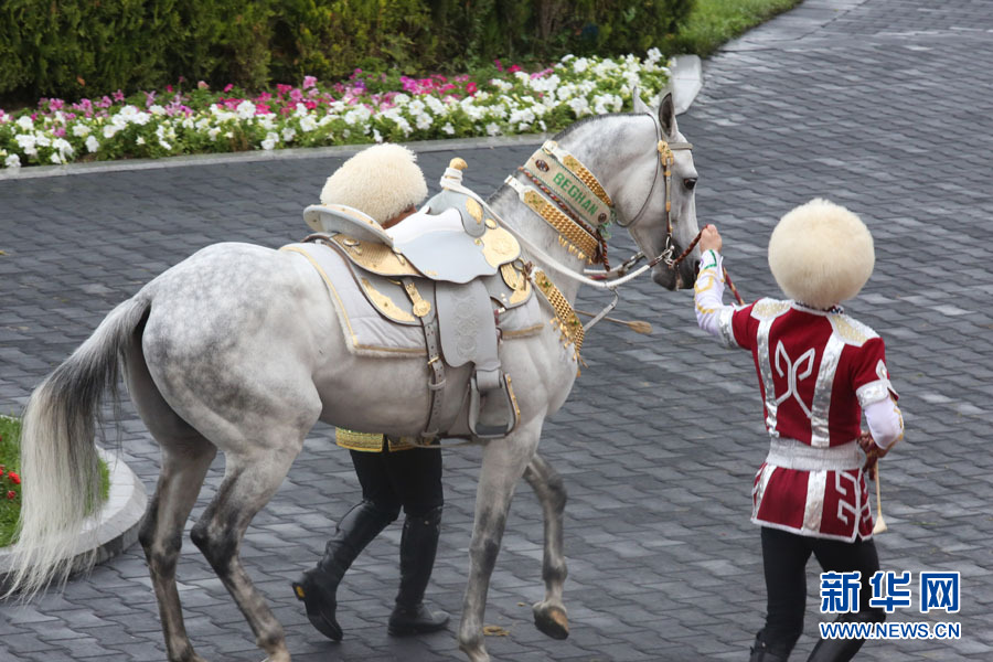 4月23日在土庫曼斯坦首都阿什哈巴德拍攝的獲得2016年度“最美汗血馬”稱號(hào)的“別格汗”。新華網(wǎng)記者 盧敬利 攝