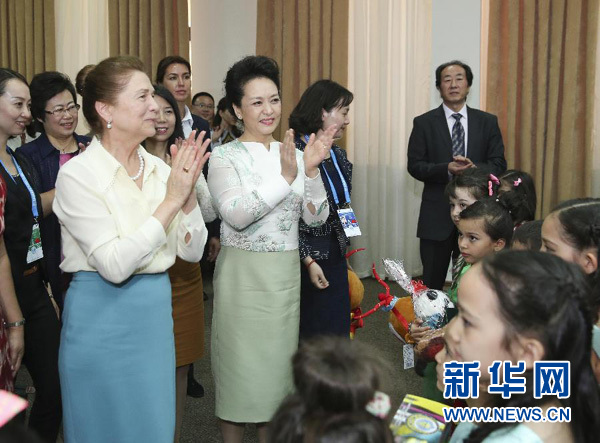當(dāng)?shù)貢r(shí)間6月22日下午,國(guó)家主席習(xí)近平夫人彭麗媛同烏茲別克斯坦總統(tǒng)卡里莫夫夫人卡里莫娃共同參觀塔什干孔子學(xué)院。這是彭麗媛和卡里莫娃為參加演出的學(xué)生鼓掌。新華社記者丁林?jǐn)z