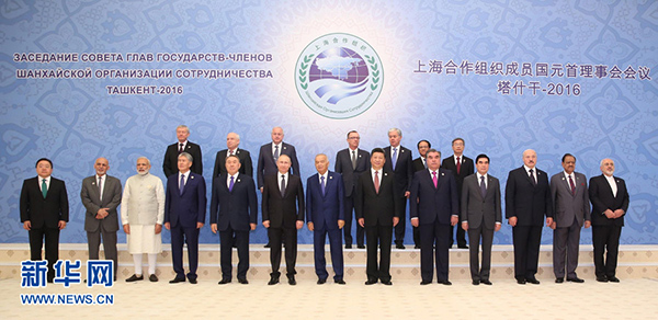 6月24日,國(guó)家主席習(xí)近平在烏茲別克斯坦塔什干出席上海合作組織成員國(guó)元首理事會(huì)第十六次會(huì)議并發(fā)表重要講話(huà)。這是大范圍會(huì)談開(kāi)始前,習(xí)近平同哈薩克斯坦總統(tǒng)納扎爾巴耶夫、吉爾吉斯斯坦總統(tǒng)阿坦巴耶夫、俄羅斯總統(tǒng)普京、塔吉克斯坦總統(tǒng)拉赫蒙、烏茲別克斯坦總統(tǒng)卡里莫夫,觀(guān)察員國(guó)阿富汗總統(tǒng)加尼、白俄羅斯總統(tǒng)盧卡申科、印度總理莫迪、蒙古國(guó)總統(tǒng)額勒貝格道爾吉、巴基斯坦總統(tǒng)侯賽因、伊朗外交部長(zhǎng)扎里夫,主席國(guó)客人土庫(kù)曼斯坦總統(tǒng)別爾德穆哈梅多夫以及有關(guān)國(guó)際和地區(qū)組織代表集體合影。新華社記者 丁林 攝