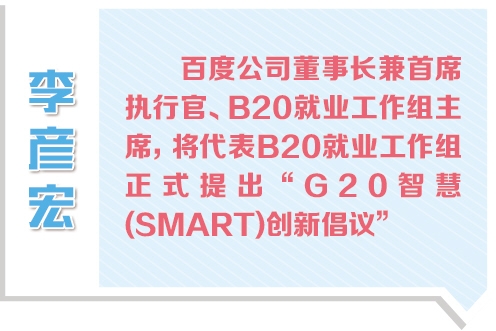 就業(yè)是B20的重點(diǎn)議題之一,也是當(dāng)今世界面臨的重要問題之一。如何創(chuàng)造更加充分、更高質(zhì)量的就業(yè)機(jī)會(huì),推動(dòng)實(shí)現(xiàn)經(jīng)濟(jì)的持續(xù)和平衡增長,是各國面臨的重要任務(wù)。根據(jù)G20杭州峰會(huì)的“創(chuàng)新增長方式”議題,B20就業(yè)工作組主席、百度公司董事長兼首席執(zhí)行官李彥宏代表B20就業(yè)工作組提出了“G20智慧(SMART)創(chuàng)新倡議”。這一倡議得到了二十國集團(tuán)工商界、商協(xié)會(huì)、國際機(jī)構(gòu)和智庫代表的廣泛認(rèn)可。