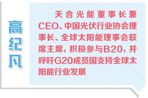 出席B20的全球太陽能理事會(huì)聯(lián)席主席、天合光能董事長兼CEO高紀(jì)凡在接受《經(jīng)濟(jì)日報(bào)》記者采訪時(shí)表示,太陽能發(fā)電已成為全球最便宜的電力資源之一,建議二十國集團(tuán)(G20)支持全球太陽能理事會(huì)“至2030年在太陽能行業(yè)創(chuàng)造1000萬個(gè)就業(yè)機(jī)會(huì)”的目標(biāo),建立太陽能領(lǐng)域的國家級、公私合作的數(shù)據(jù)收集和傳播網(wǎng)絡(luò)。